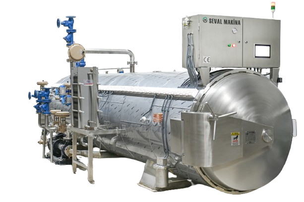 Otoklav içerisinde otomatik sepet hareket ettirme sistemi sayesinde bir taraftan giren ürünler diğer taraftan çıkarak üretim bandınızın aksamamasını sağlar ve verimliliğinizi artırır.